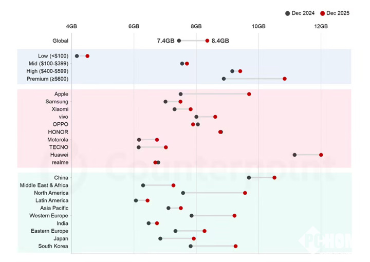 据CounterPoint Research提供的数据袒露,2025年12月的民众手机阛阓平均内存达到了8.4GB RAM,比拟2024年同期的7.8GB RAM提高了0.6GB RAM,创造了手机平均内存的新高。