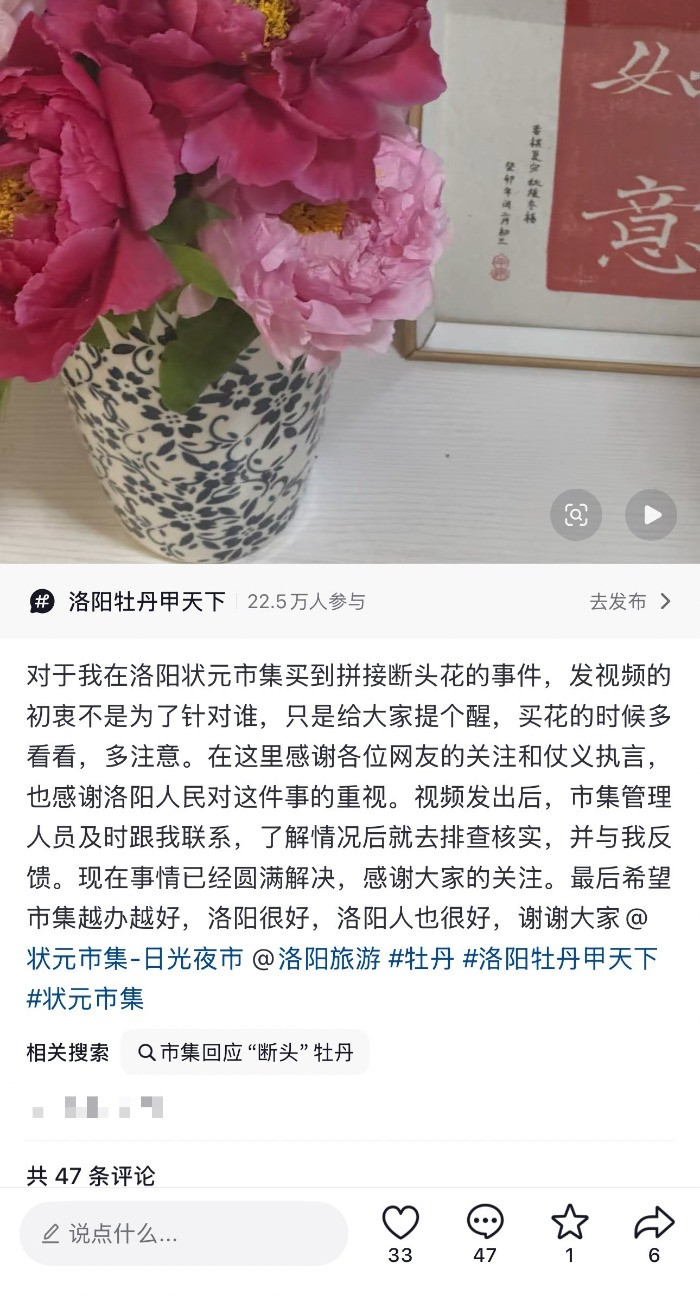 大皖新闻讯4月6日晚,别称搭客在酬酢平台发文吐槽,马上激勉热议。该搭客称,明朗假期,她往复一千多公里专程前去河南洛阳游玩,临别之际有益在洛阳状元市集购买了一束牡丹带回家中莳植。不虞回家后发现,其中一枝牡丹——花苞与根茎早已鉴别,仅靠一根牙签免强固定——竟是“断头花”。(详见此前报谈)4月8日晚,洛阳状元市集蓝V认证商家号发布情况说明,“阐明花并非市集内商户所售。”