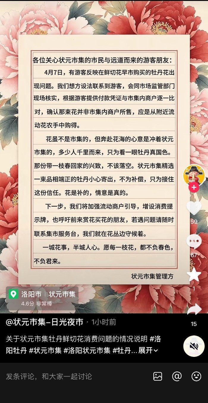 说明中同期写谈:“花虽不是市集的,但奔赴花海的情意是冲着状元市集的。若干东谈主沉而来,只为看一眼牡丹真国色。那份带一枝春回家的酷爱,不该阻滞。”为此,状元市集精选一束品相法律评释的牡丹提神寄出,“不为抵偿,只为接住这份信任。花是补的,情意是确切。”