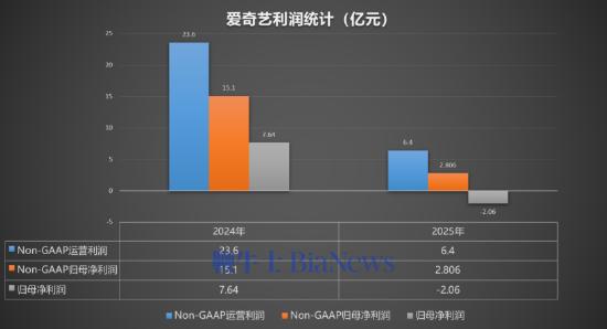 忧的一面是,自2023年《狂飙》创下自高级热度后,其已贯穿2年营收下滑,客岁同比减少为7%。受到营收下滑的遭殃,爱奇艺虽贯穿4年完结Non-GAAP(非好意思国通用司帐准则)运营盈利,但2025年该利润额同比缩水7成,包摄于爱奇艺的净利润则由盈转亏。