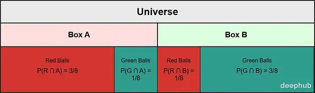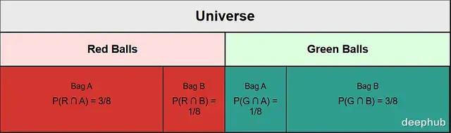 P(G ∩ A) = 1/8 = Green balls A contains / total number of balls in whole universe