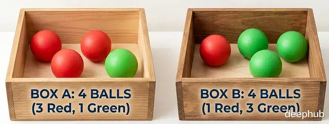 假设有两个盒子:盒子 A 和盒子 B。盒子 A 装了 4 个球,3 红 1 绿;盒子 B 相似装了 4 个球,1 红 3 绿。
