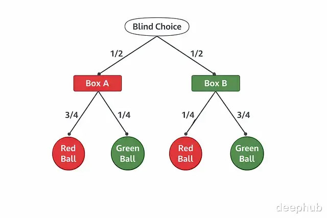一个蒙着眼的东谈主站在两个盒子前边,赶紧选中任一盒子的概率是 1/2。采取了某个盒子,比如盒子 A,从中摸到红球的概率是 3/4,摸到绿球的概率是 1/4。