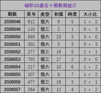 开奖转头:福彩3D上期开奖号为264,和值为12,跨度4,其中奖号大小比为1:2